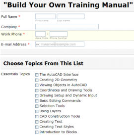 Custom Training Manuals:It happens all the time. Your customer has special needs encompassing partial content from one manual or content from multiple training manuals. You need customized courseware and you would like to write it yourself, but don’t have the time. So, you hit the CyberTek Publishing web site, pick the topics that your customer needs, and let us build your training manual for you. Simple!You can choose from Basic Essentials AutoCAD topics or Advanced AutoCAD topics or mix and match Basic Essentials AutoCAD topics with Advanced AutoCAD topics to create your very own customized AutoCAD training manual. This feature is excellent for the trainer who has a client with very specific training requirements, or for the CAD Manager who wants to conduct in-house training but would like some excellent training materials to assist that effort.